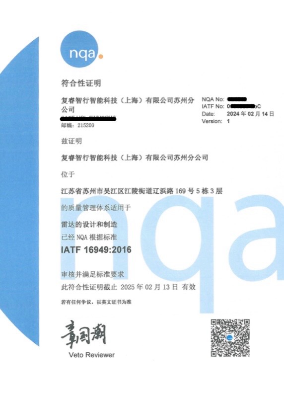 本次顺利通过IATF 16949认证,再一次验证了复睿智行的质量管理能力。公司未来将在销售、研发、制造、质量管理、服务等各个方面持续追求高水平管理,不断提高产品品质和交付质量,将质量管理体系的精髓真正落到实处,致力于为汽车和其他终端市场的客户提供高性能、高质量且高性价比的毫米波雷达产品。